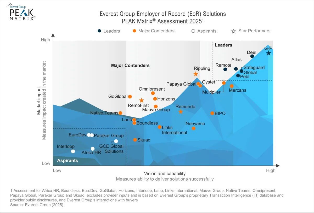The Everest Group’s “EoR Solutions PEAK Matrix® Assessment 2025” evaluates 29 providers based on market impact, vision, and capabilities. This report showcases key trends shaping global EoR adoption, including remote work growth, compliance complexity, and advanced technology-enabled services.