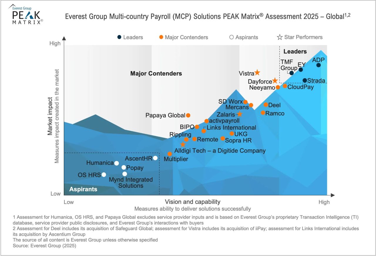 The Everest Group’s “MCP Solutions PEAK Matrix® Assessment 2025” evaluates 28 providers for their ability to deliver multi-country payroll solutions that ensure compliance, efficiency, and an enhanced employee experience. The report emphasizes key trends, including AI-driven payroll validation, automation-enhanced reporting, and integrated payroll ecosystems.